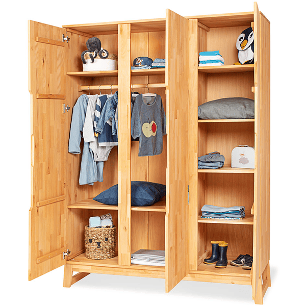 Gracias a la amplia construcción y a las 3 puertas, el armario ofrece suficiente espacio para la ropa, la ropa de cama y otros utensilios. Los 6 estantes, algunos de ellos regulables en altura, permiten mantener el orden en el interior. Para proteger los dedos de los niños pequeños de desagradables magulladuras cuando juegan o exploran, el armario está equipado con el sistema Self-Soft-Close, que permite que las puertas se cierren de forma silenciosa y segura. La estructura de madera claramente visible y los tiradores empotrados son un verdadero reclamo en la habitación de cualquier niño. La madera natural, aceitada y maciza redondea la Design .