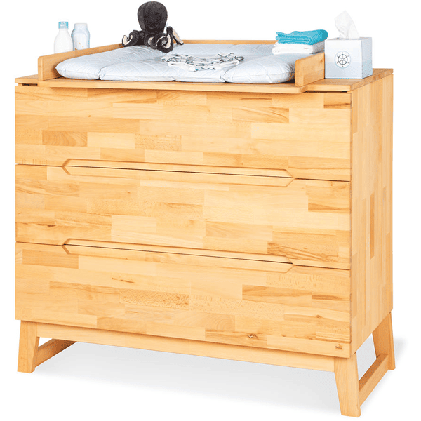 La estructura de madera claramente visible y las empuñaduras fresadas empotradas llaman la atención en cualquier guardería. El cambiador puede montarse a la izquierda, a la derecha o en el centro, o puede retirarse por completo para crear un moderno lateral board . La amplia construcción y los tres grandes cajones aden proporcionan suficiente espacio para pañales, productos de cuidado y otros accesorios. Después de la hora del cambio de pañales, también se pueden guardar allí camisetas, pantalones o jerseys. Los cajones están equipados con el probado sistema Self-Soft-Close, que les permite cerrarse de forma segura y silenciosa. Los dedos de los niños pequeños también están protegidos de las desagradables magulladuras cuando ayudan a sacar los utensilios para cambiar los pañales.