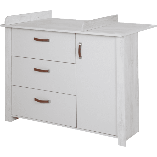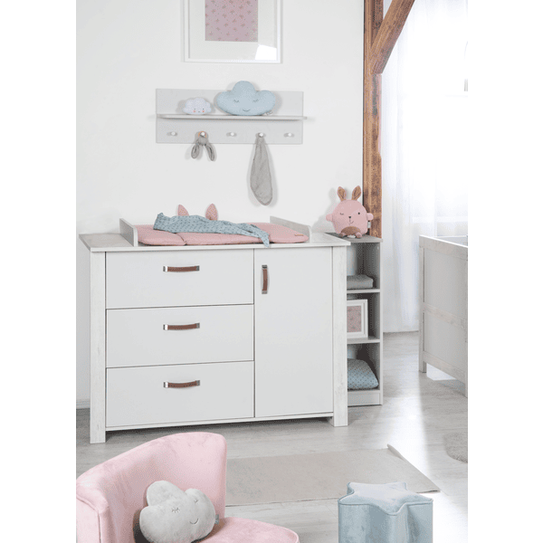 El cambiador roba con tapa cambiadora es un verdadero todoterreno y le servirá durante muchos años. El robusto cambiador puede utilizarse como asiento elevado para su hijo de guardería, para que pueda ayudarle fácilmente a vestirse en una cómoda posición de pie. Más adelante, el cambiador puede utilizarse como cómoda en el salón o en la habitación del niño. El cambiador con asas de aspecto de cuero y sin tornillos visibles en modern es una de nuestras versiones más amplias. Con otros muebles infantiles de la serie «Mila», puede crear una elegante habitación infantil o de bebé. El cambiador se ha desarrollado en Alemania y cumple las normas de seguridad vigentes según la norma EN 12221 – 1+2:2008 + A1:2013. El cambiador «Mila» es fácil de montar.