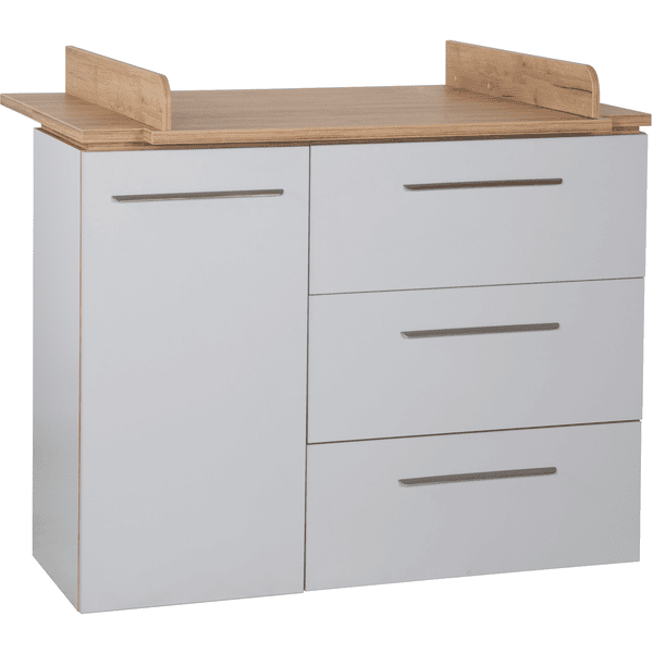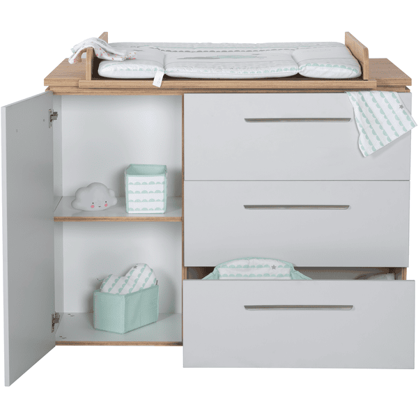 La tecnología de cierre suave incorporada garantiza que la puerta y los 3 cajones aden se cierren con suavidad. El cajón superior del cambiador se puede extraer por completo y ofrece espacio para guardar los utensilios del cambiador. Gracias a la extensión total del cajón superior, todo está al alcance de la mano para el cuidado del bebé. Con otros muebles infantiles de la serie «Tobi», puedes crear una elegante habitación para niños o bebés. El cambiador roba con tapa cambiadora es un verdadero todoterreno y le servirá durante muchos años. El robusto cambiador puede utilizarse como asiento elevado para su hijo de guardería, de modo que pueda ayudarle a vestirse fácilmente en una cómoda posición de pie. Más adelante, el mueble cambiador se convertirá en una cómoda en el salón o en el cuarto de los niños.