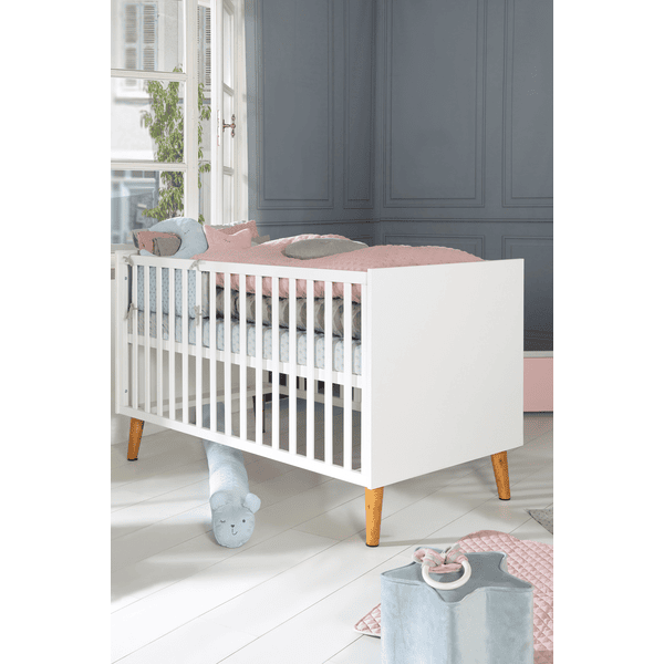La cuna combinada «Mick» puede utilizarse hasta que el niño tenga 7 años (o hasta un peso corporal de 50 kg). La cama infantil roba y Junior sin tornillos visibles en la parte delantera tiene una superficie de reposo de 70 x 140 cm. Si desea convertir la cuna en una cama de cuatro postes, nuestros juegos de cuna de 4 piezas, compuestos por almohada, manta, dosel y nido, son ideales.