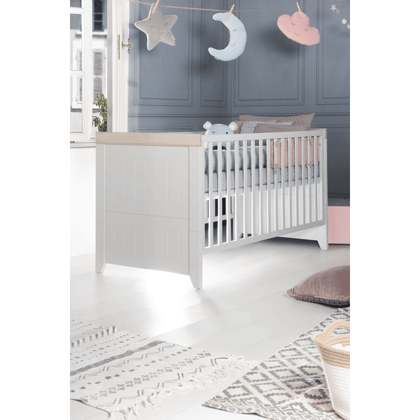 Cuando su bebé sea mayor, la cuna combinada puede convertirse en una cama Junior con los lados de conversión disponibles por separado. El cabecero y el piecero de la cuna combinada con secciones fresadas de alta calidad y modern en tacos con pie cónico pueden dividirse. Cuando se convierte en una cama Junior , se utilizan las dos mitades superiores del cabecero y el piecero para crear un nuevo aspecto en la habitación de los niños. La cuna combinada «Helene» puede utilizarse hasta que el niño tenga 7 años (o hasta un peso corporal de 50 kg). La cama infantil roba y Junior tiene una superficie de reposo de 70 x 140 cm. Si desea convertir la cuna en una cama de cuatro postes, nuestros conjuntos de cuna de 4 piezas roba , compuestos por almohada, manta, dosel y nido, son ideales.